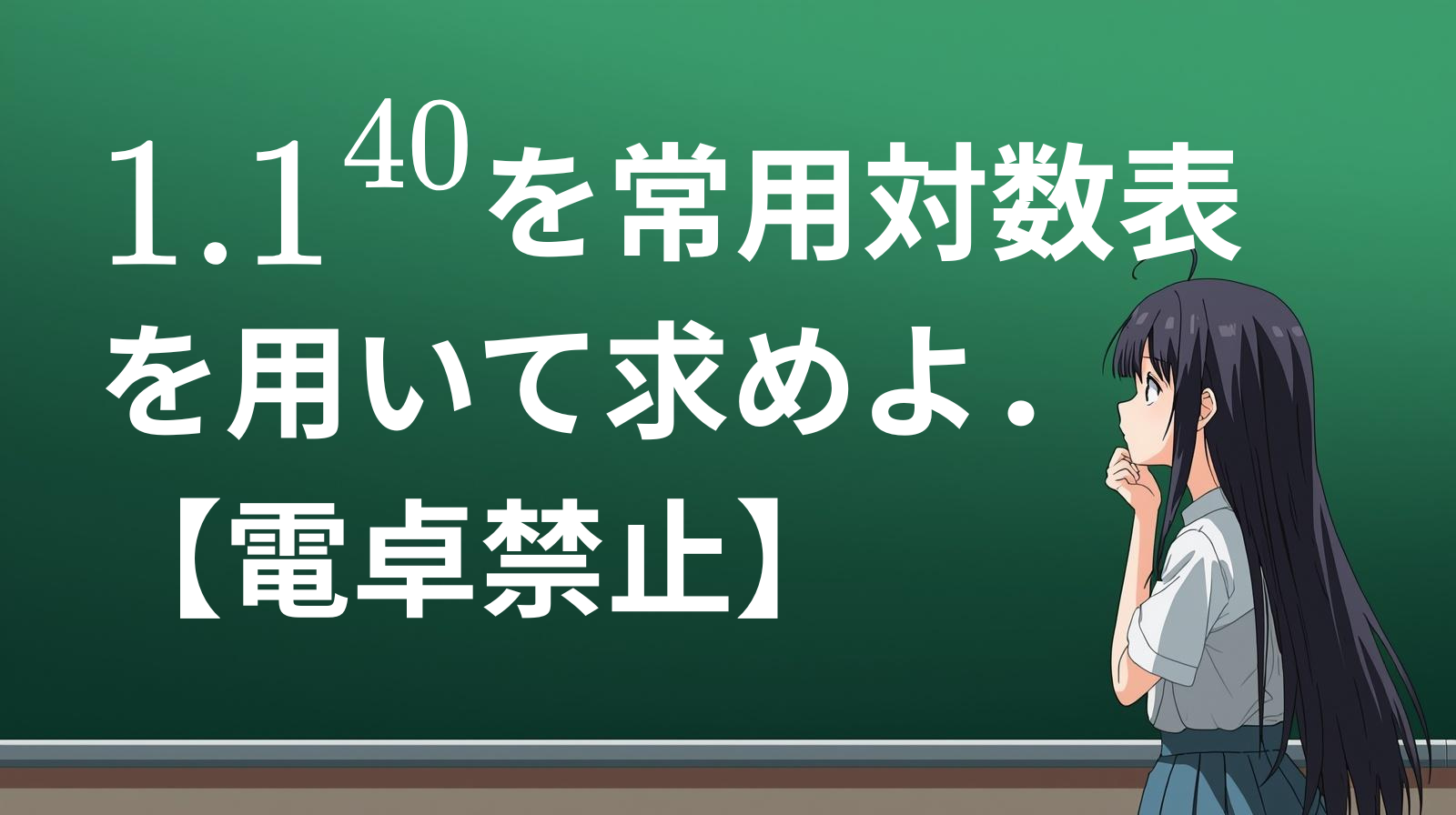 (※もし試験などで手元に電卓がなく、近似値を求めなければならない場合は「常用対数表」を用います。この魔法のような計算テクニックについては、【高校数学】常用対数表は「桁数」だけじゃない!1.1の40乗の近似値を計算する方法の記事で詳しく解説しています。)