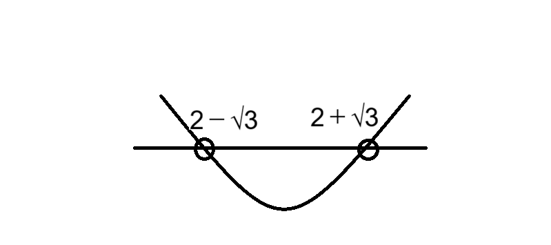 グラフを見ると、2 – √3 から 2 + √3 の間の範囲で、放物線がx軸の下に潜り込んでいることが一目で分かります。