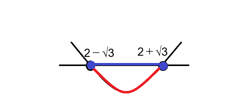 x軸の左側に 2 – √3、右側に 2 + √3 の目盛りを打ち、Uの字のグラフを書きます。