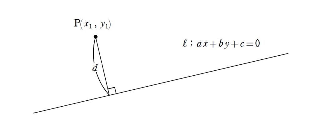 座標平面上の点 $P(x_1, y_1)$ と、直線 $l: ax + by + c = 0$ の間の距離 $d$ は、