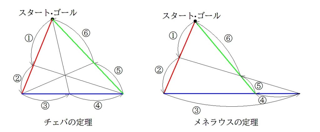・ メネラウスの定理: 三角形を横切る「1本の線」に注目。