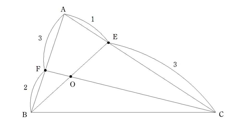 三角形 $ABC$ において、辺 $AB$ を $3:2$ に内分する点を $F$、辺 $AC$ を $1:3$ に内分する点を $E$ とし、$BE$ と $CF$ の交点を $O$ とします。このとき、$BO:OE$ の比を求めなさい。