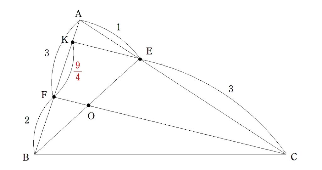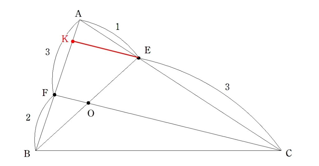$AE : EC = 1 : 3$ なので、$AK : KF$ も $1 : 3$ になります。