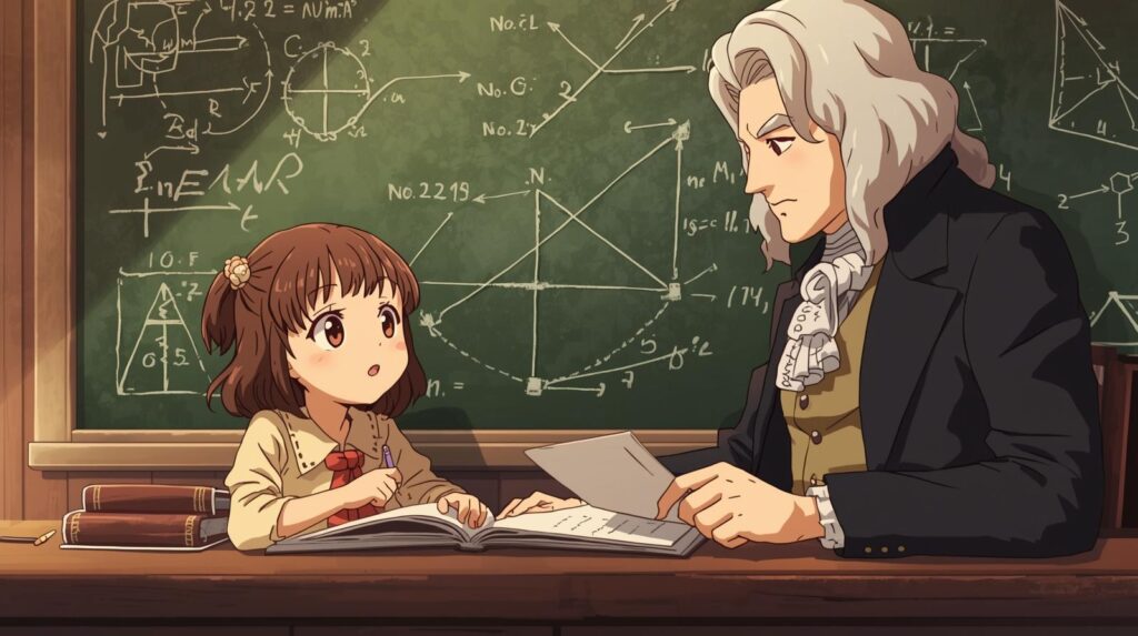 が書かれた部屋で、ニュートンが何かを説明しており、それを真剣なまなざしで聞くアニメ風のかわいい女の子-1024x573.jpg)